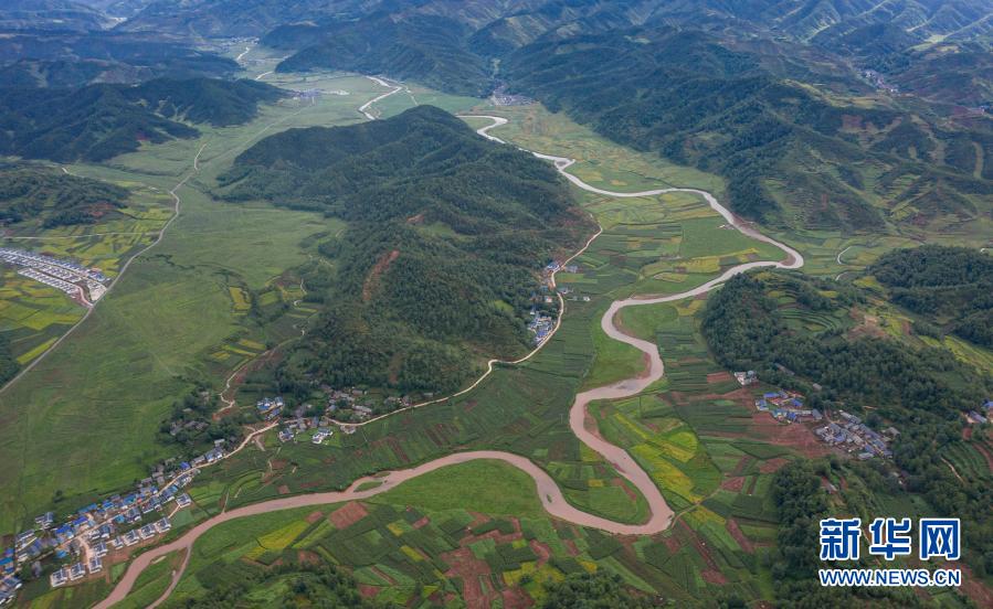 金陽縣熱柯覺鄉(xiāng)丙乙底村境內(nèi)蜿蜒盤旋的旅游道路(6月5日攝,無人機(jī)照片)。新華社記者 江宏景 攝
