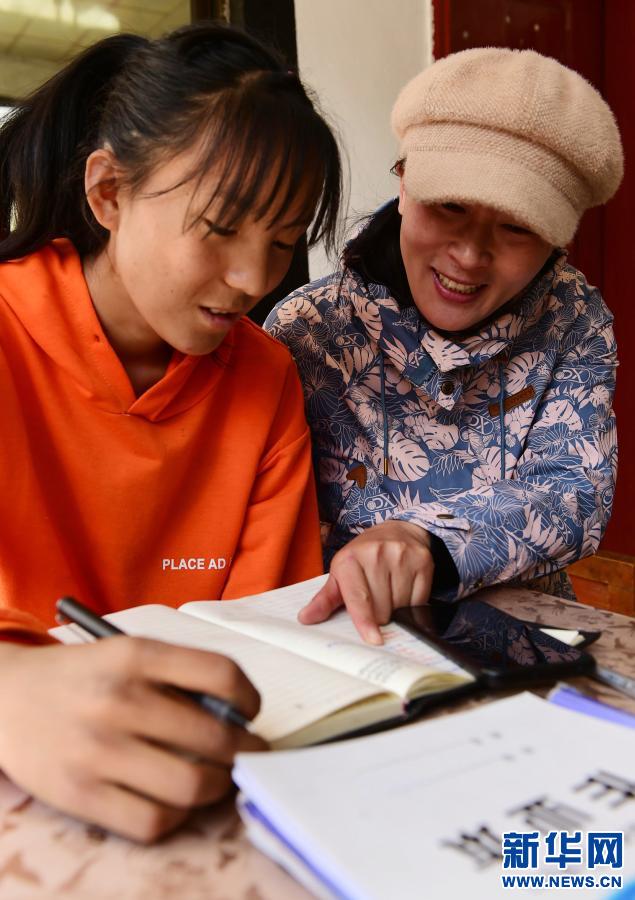 2020年3月26日,在西藏林芝市朗縣扎西塘村的一戶建檔立卡貧困戶家中,西藏林芝市委宣傳部駐村工作隊員何曉雪(右)正在為學(xué)生輔導(dǎo)功課。 新華社發(fā)(索朗羅布 攝)