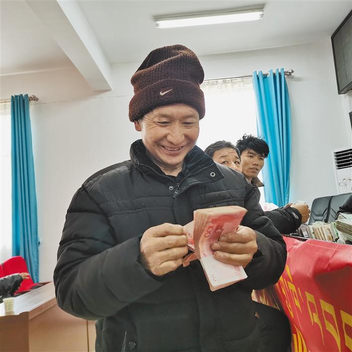 圖為卡瑪村村民斯塔次旦在合作社開心地?cái)?shù)著自己的分紅和工資。記者 曲珍 萬(wàn)靖 攝