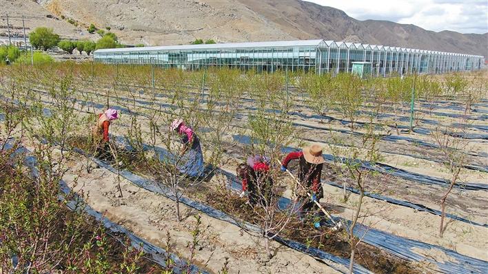 圖為當(dāng)?shù)厝罕娫诳ㄈ玎l(xiāng)大桃種植基地里干農(nóng)活。記者 裴聰 格桑倫珠 攝