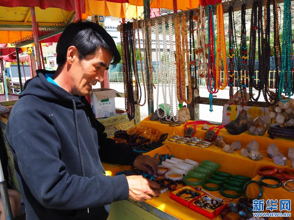 西藏山南市乃東區(qū)門(mén)中崗社區(qū)居民頓珠白瑪在自己的工藝品攤位上(6月24日攝)。新華社記者 金一清 攝
