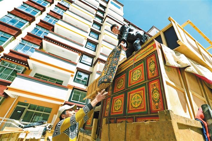 墨竹工卡縣嘎則新區(qū)易地搬遷群眾將家具搬入新居。