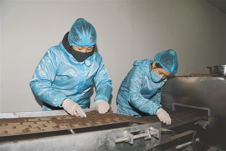 圖為定結(jié)縣江嘎熱電子商務(wù)服務(wù)中心的員工在生產(chǎn)雞爪谷餅干。記者 李洲 攝