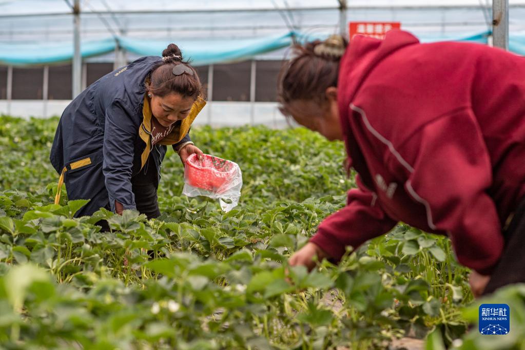 南伊村村民在采摘草莓(4月12日攝)。新華社記者 晉美多吉 攝