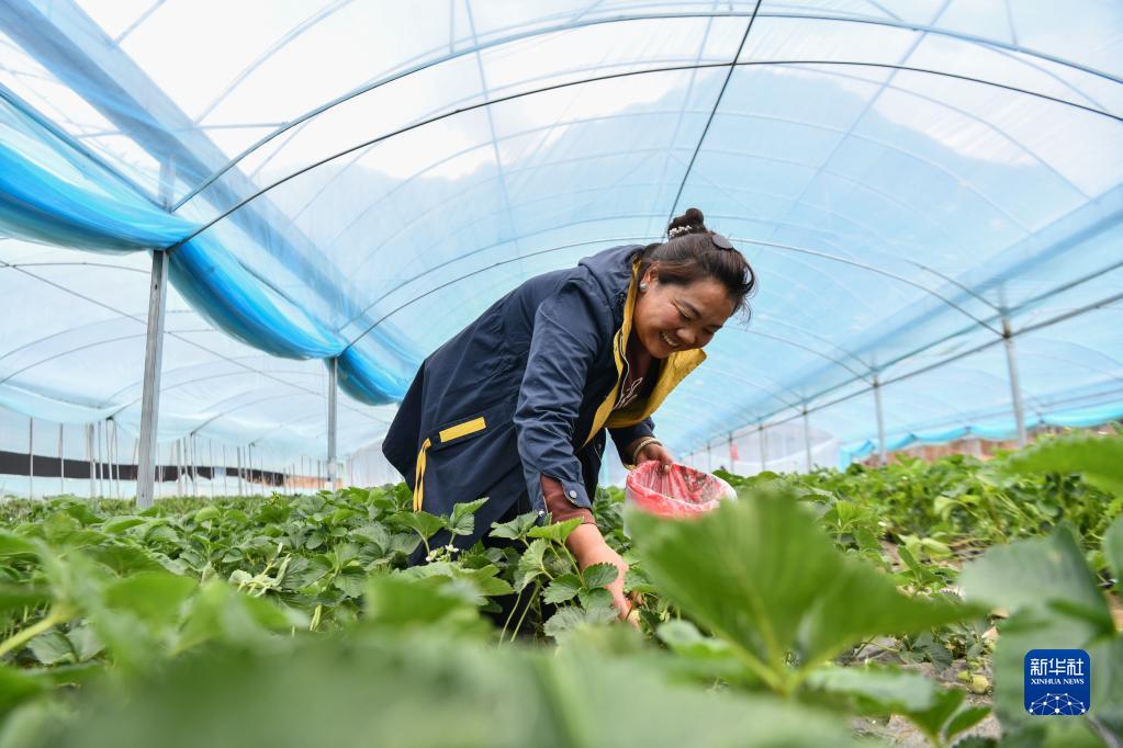 南伊村村民亞夏在采摘草莓(4月12日攝)。新華社記者 晉美多吉 攝