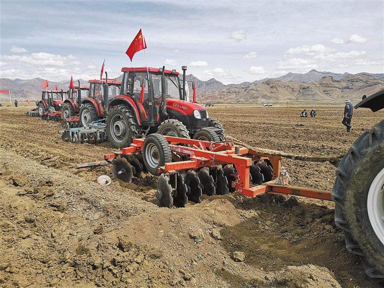 圖為林周縣曲嘎強(qiáng)村村民用農(nóng)用機(jī)械平整土地種植燕麥飼草。楊先亮 攝記者 李成業(yè)
