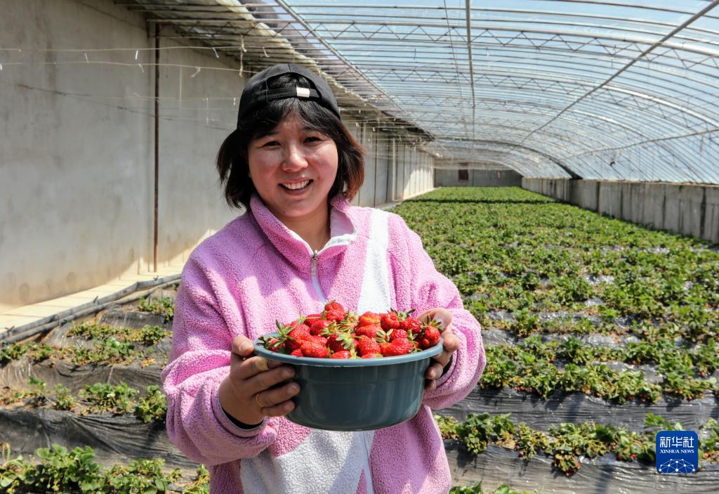 來(lái)自河南的農(nóng)民楊華麗在西藏阿里地區(qū)噶爾縣生態(tài)農(nóng)業(yè)產(chǎn)業(yè)園展示自己種出的草莓(2022年4月10日攝)。新華社記者 姜帆 攝