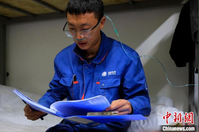 圖為付新程完成當日的檢修工作,在宿舍內(nèi)一邊吸氧氣,一邊研究工作方案?!∶犀| 攝