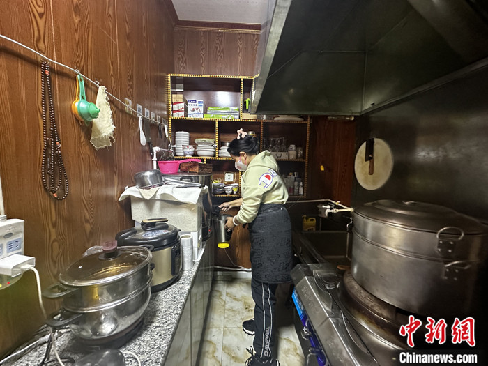 資料圖為長江源村的一家藏餐吧內,店主李新財?shù)钠拮釉诿β怠?中新社記者 李雋 攝