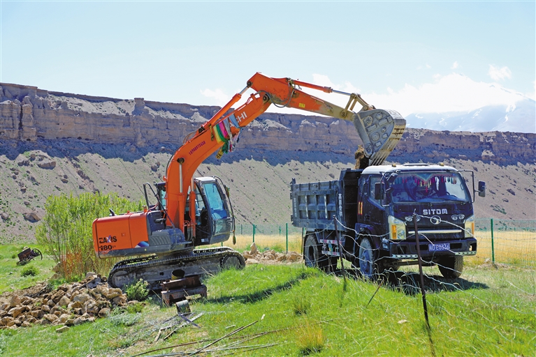 普蘭縣普蘭鎮(zhèn)仁貢村孔雀施工隊的機械車輛在施工,當?shù)厝罕娫谄仗m縣普蘭鎮(zhèn)施工隊務(wù)工,一天可增收230元。記者 溫凱 攝