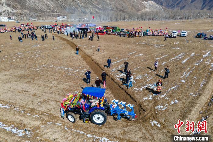 2023年3月16日,西藏拉薩林周縣農牧民舉行隆重的春耕開耕儀式。(無人機拍攝)中新社記者 江飛波 攝