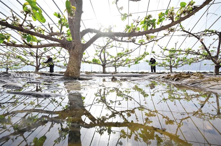 河北省灤州市茨榆坨鎮(zhèn)的果農(nóng)在大棚內(nèi)給櫻桃樹(shù)疏花。