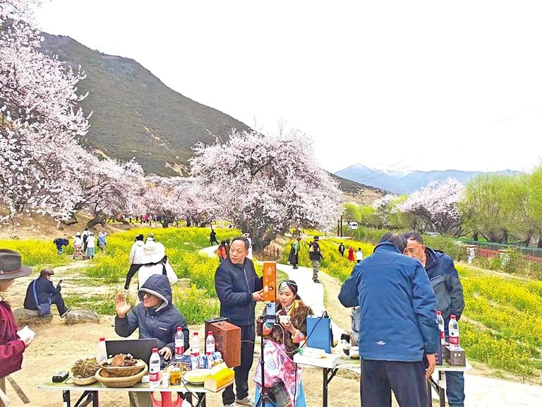 林芝市職業(yè)技術(shù)學(xué)校學(xué)生在嘎拉村直播,宣傳推介桃花旅游文化節(jié)、工布民俗風(fēng)情及農(nóng)特產(chǎn)品等。 記者 謝筱純 王珊 攝