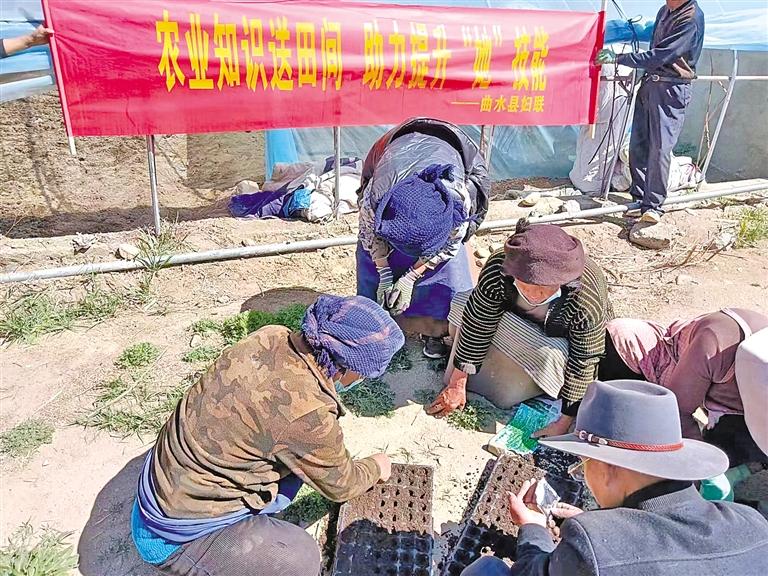 圖為曲水村婦女在學習育苗技術。 記者 格桑倫珠 攝