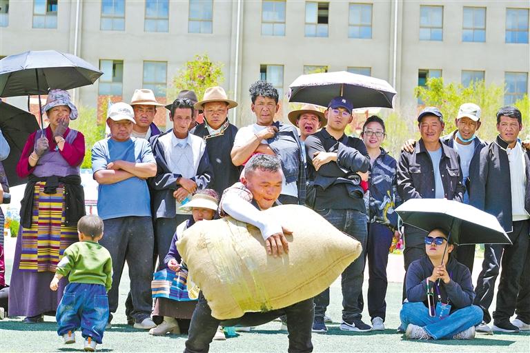 圖為桑珠孜區(qū)城北街道舉辦慶祝第八個“日喀則市民族團結(jié)進步日”暨“全民來健身 健康你我他”社區(qū)運動會。這是參賽選手在進行抱石頭比賽。