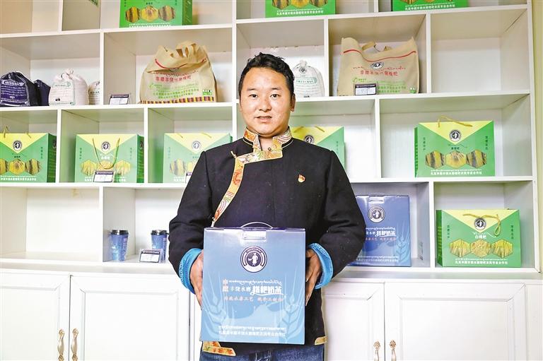 申藏村村民委員會(huì)副主任、鄉(xiāng)村振興專(zhuān)干久米旺久展示扎其申藏豐饒水磨糌粑合作社的產(chǎn)品。記者 頓珠扎西 攝
