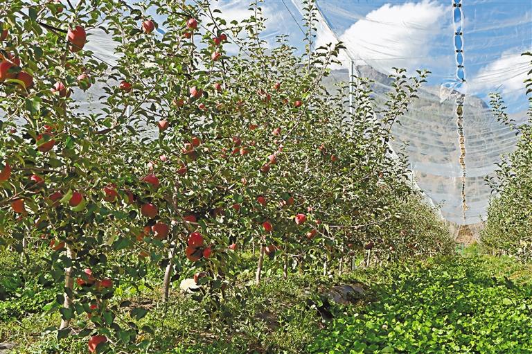 矮砧寬行密植的蘋果樹被劃分成一個(gè)個(gè)區(qū)域?!斑@是我們的多功能網(wǎng)室,是一種以高密度聚乙烯為主料的防護(hù)網(wǎng)。能抗大風(fēng),減少冰雹、暴曬等惡劣天氣帶來的影響。”增巴村蘋果種植基地技術(shù)員劉傳海介紹道。