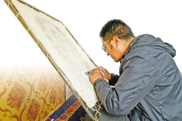 圖為洛隆縣康布農(nóng)牧民文化手工藝專業(yè)合作社的畫師在繪制唐卡。記者 次仁平措 攝