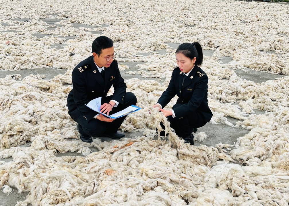 拉薩海關(guān)所屬八廓海關(guān)關(guān)員在外貿(mào)企業(yè)調(diào)研西藏羊毛羊絨。(拉薩海關(guān)供圖)