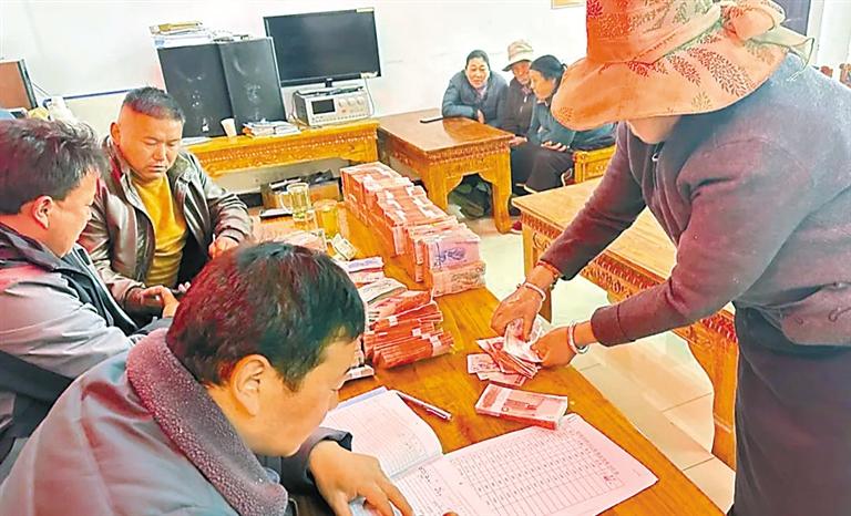 圖為工布江達縣工布江達鎮(zhèn)結地崗村向群眾發(fā)放分紅款。
