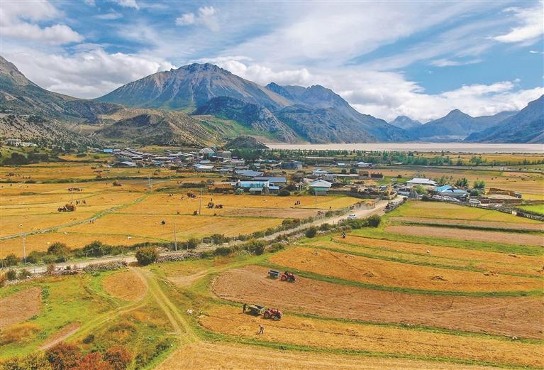 金秋時節(jié),昌都市八宿縣然烏鎮(zhèn)雅卡村的青稞田一片金黃,鋪展至巍峨的雪山腳下,構(gòu)成一幅動人的畫卷。伴隨著機(jī)器的轟鳴,青稞收割正式開始,村民駕駛著農(nóng)用車來回運輸,一派熱鬧繁忙的豐收景象。