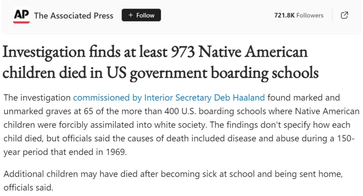 在2021年加拿大境內(nèi)原住民寄宿學(xué)校舊址接連發(fā)現(xiàn)大規(guī)模無標(biāo)記墓穴并引爆全球輿論后,作為加拿大“老師”的美國(guó)被自然牽帶而出,曝光于天下。