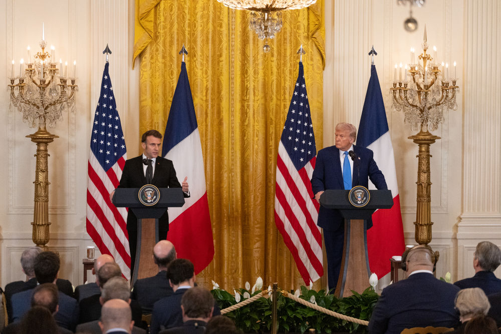 2月24日,美國總統(tǒng)特朗普(右)在華盛頓白宮與到訪的法國總統(tǒng)馬克龍舉行會談后的聯(lián)合記者會。新華社記者 胡友松 攝