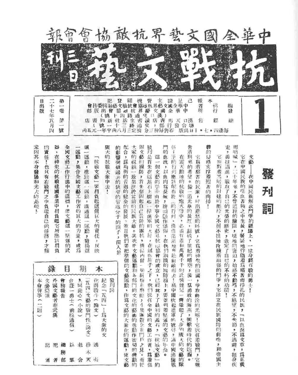 1938年3月,由老舍、郭沫若、郁達(dá)夫等作家及馮玉祥、邵力子等知名人士籌備的中華全國(guó)文藝界抗敵協(xié)會(huì)(簡(jiǎn)稱(chēng)“文協(xié)”),在武漢漢口總商會(huì)禮堂宣告成立,號(hào)召“我們應(yīng)該把分散的各個(gè)戰(zhàn)友的力量,團(tuán)結(jié)起來(lái),像前線將士用他們的槍一樣,用我們的筆,來(lái)發(fā)動(dòng)民眾,捍衛(wèi)祖國(guó),粉碎寇敵,爭(zhēng)取勝利。”隨后,其會(huì)刊《抗戰(zhàn)文藝》發(fā)刊,承載著愛(ài)國(guó)文藝工作者挽救中華民族、抗戰(zhàn)到底的決心,成為貫通整個(gè)抗戰(zhàn)時(shí)期的核心文藝陣地,匯聚文藝力量的精神堡壘。