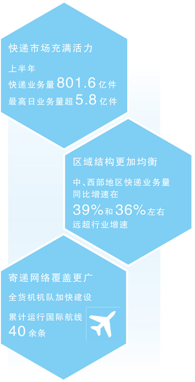 看發(fā)展動(dòng)力,上半年,快遞市場(chǎng)充滿活力、運(yùn)行良好,最高日業(yè)務(wù)量超5.8億件。