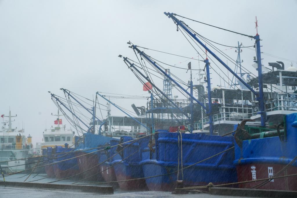 7月25日下午,在位于福建省莆田市秀嶼區(qū)埭頭鎮(zhèn)的石城國(guó)家一級(jí)漁港,今年第3號(hào)臺(tái)風(fēng)“格美”的外圍風(fēng)圈已經(jīng)襲來。七八級(jí)的陣風(fēng)夾雜著豆大的雨點(diǎn)打在臉上,裹挾著三四米高的海浪拍擊著護(hù)堤,激起白茫茫一片水花。漁港里,100多艘大小船舶已在24日中午12點(diǎn)前回港,呈“半月環(huán)抱”狀整齊停泊,船舶間已用纜繩加固。