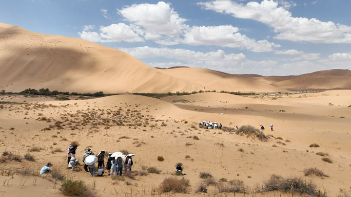 2024年7月31日,來自蘭州大學(xué)、香港浸會(huì)大學(xué)、西南大學(xué)等18所高校的100余位師生在巴丹吉林沙漠開展“發(fā)現(xiàn)計(jì)劃”地理學(xué)聯(lián)合實(shí)習(xí),這是部分師生在巴丹吉林沙漠中開展植被樣方調(diào)查(無人機(jī)照片)。
