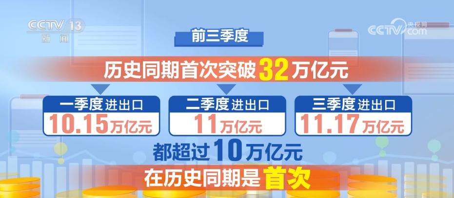 前三季度,歷史同期首次突破32萬億元,各季度分別進出口10.15萬億元、11萬億元、11.17萬億元,都超過了10萬億元,這在歷史同期也是首次。