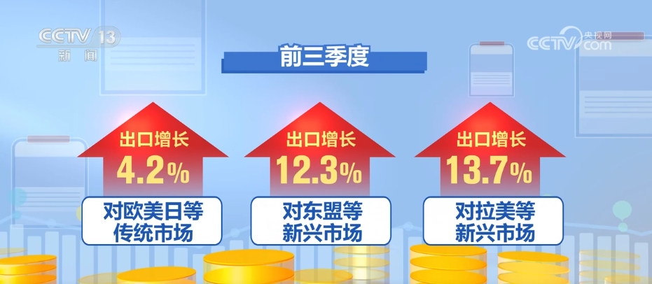 需求方面,從國際看,最新的世貿(mào)組織報告上調了對全年貨物貿(mào)易量增速的預測,世界銀行、經(jīng)合組織等機構認為全球經(jīng)濟正在企穩(wěn),外需回暖為我國出口創(chuàng)造了有利條件。前三季度,我國對歐美日等傳統(tǒng)市場出口增長了4.2%,對東盟、拉美等新興市場出口分別增長了12.3%、13.7%。