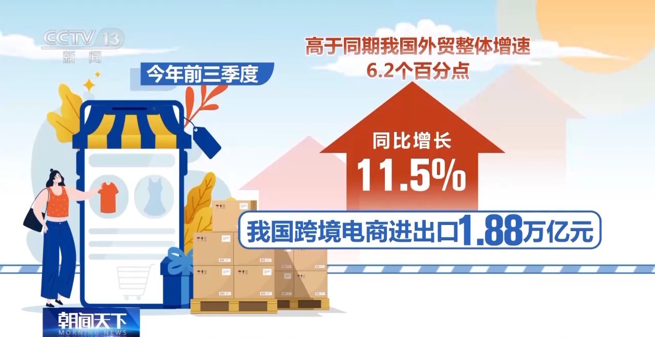 據(jù)海關(guān)總署最新發(fā)布的數(shù)據(jù)顯示,今年前三季度,我國(guó)跨境電商進(jìn)出口1.88萬(wàn)億元,同比增長(zhǎng)11.5%,高于同期我國(guó)外貿(mào)整體增速6.2個(gè)百分點(diǎn),正成為我國(guó)外貿(mào)增長(zhǎng)新動(dòng)能。