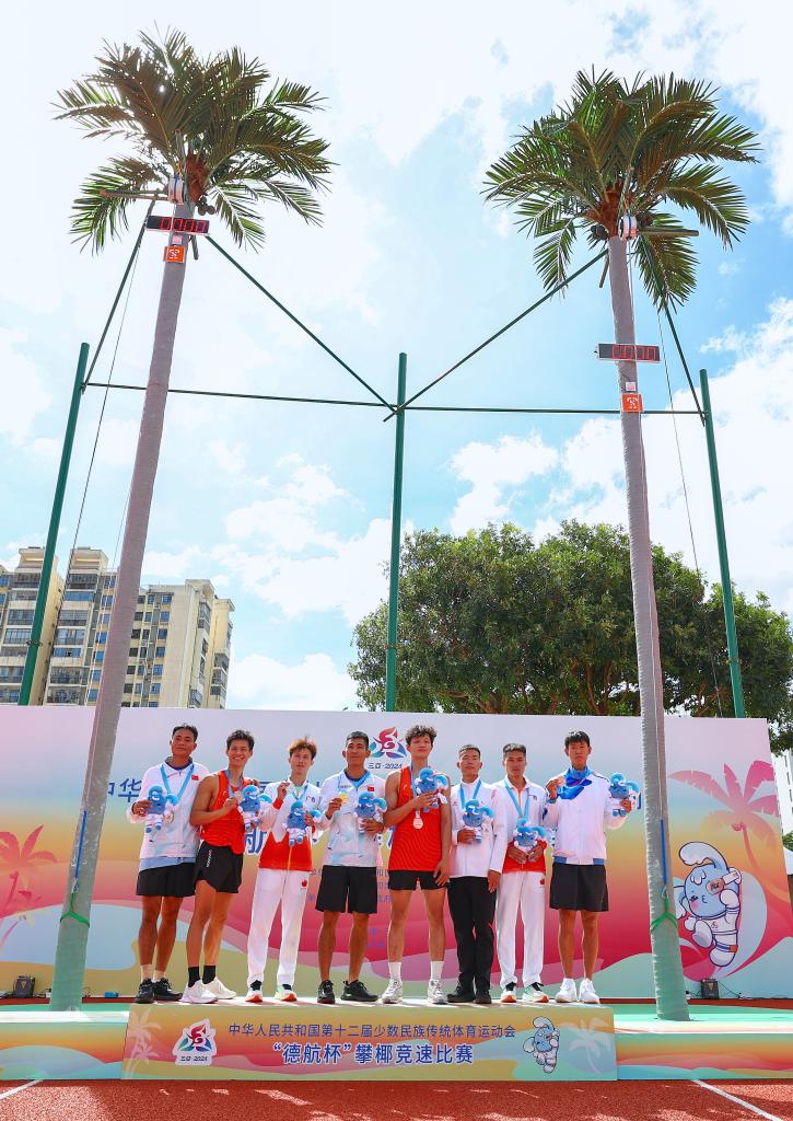 11月24日,獲獎(jiǎng)選手在頒獎(jiǎng)儀式上合影。當(dāng)日,第十二屆全國少數(shù)民族傳統(tǒng)體育運(yùn)動(dòng)會(huì)攀椰競速男子9米決賽在西南大學(xué)三亞中學(xué)體育場(chǎng)舉行。新華社記者 楊植森 攝