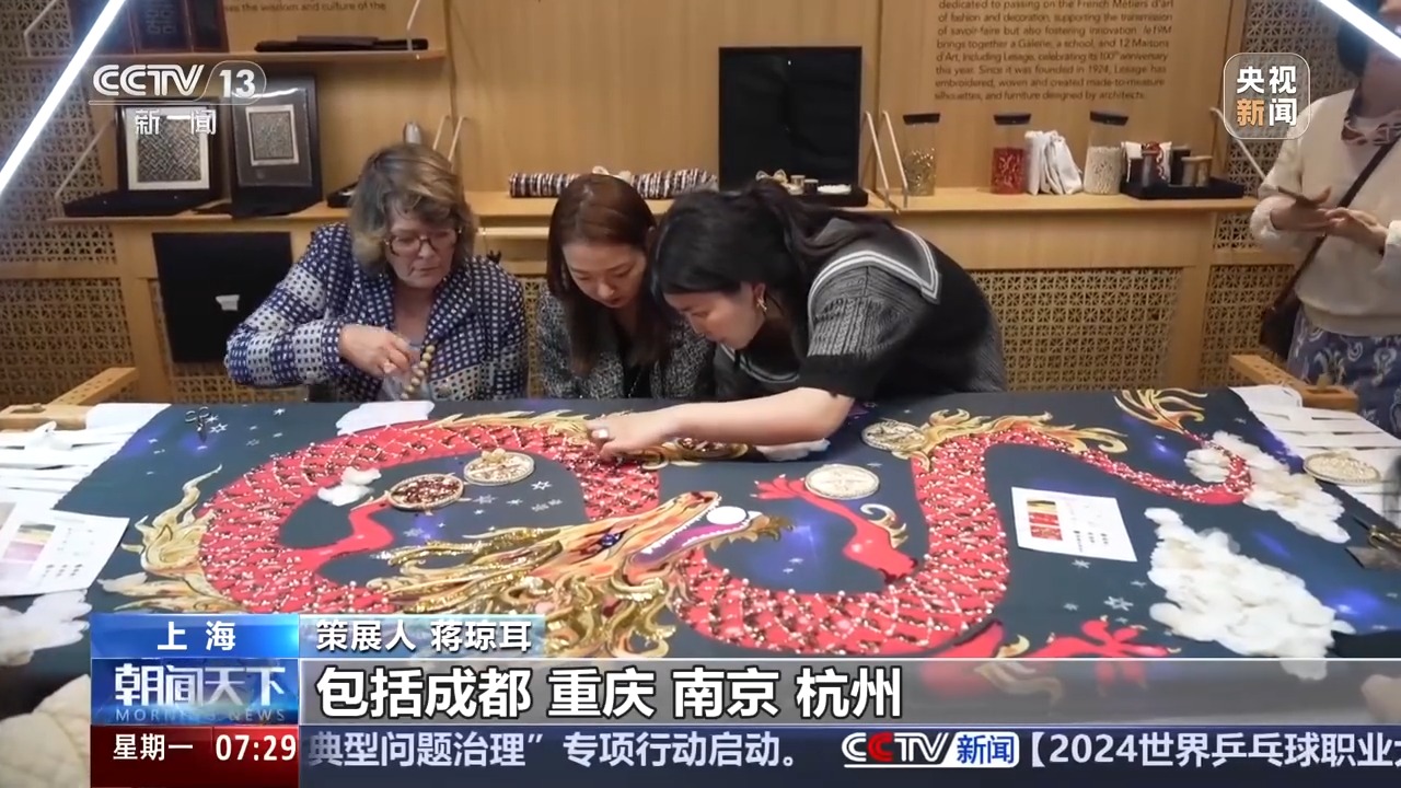總臺央視記者 高媛:我身后這個不大的空間里擠滿了人,這里聚集了17個來自法國的品牌。它們展出的不只是產品,而是背后的工藝。精美的產品變成了一針一線的故事,觀眾還可以參與其中。