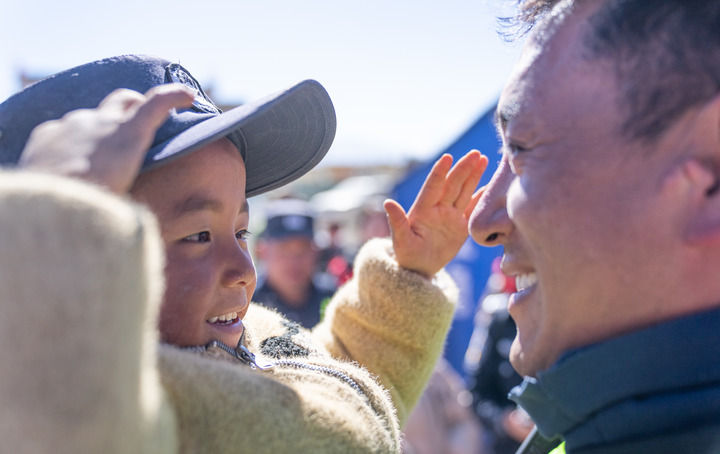 2025年1月14日,在西藏定日縣長所鄉(xiāng)嘎布村,一個孩子戴上移民管理警察米瑪次仁的帽子敬禮。新華社記者 丁增尼達 攝