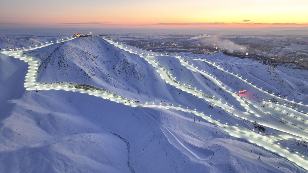 黃昏時(shí)分的將軍山國際滑雪度假區(qū)(1月24日攝,無人機(jī)照片)。將軍山國際滑雪度假區(qū)在夜間開放多條雪道,以滿足“雪友”多樣化需求。