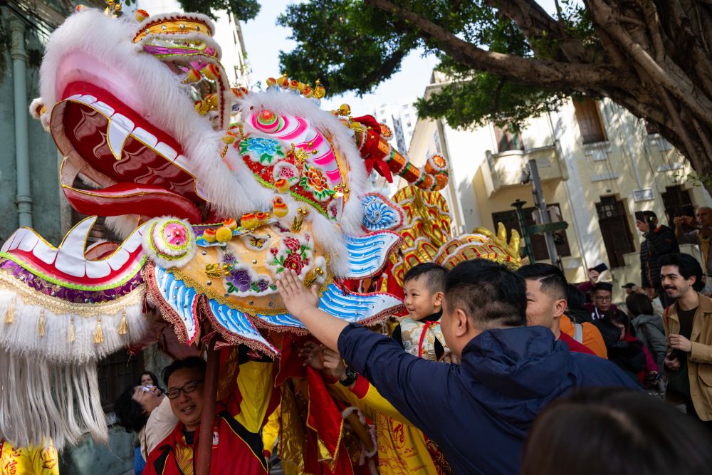1月29日,舞龍隊伍在澳門風順堂區(qū)與市民互動。新華社發(fā)(張金加攝)