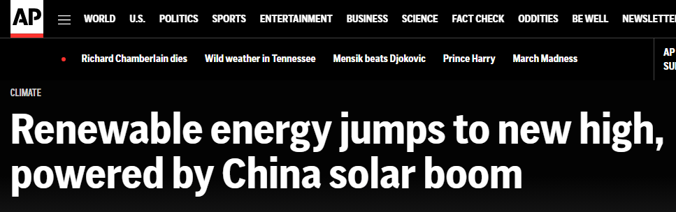 報(bào)道稱(chēng),中國(guó)太陽(yáng)能熱潮推動(dòng)了全球可再生能源發(fā)展。數(shù)據(jù)顯示,2024年,中國(guó)可再生能源發(fā)電新增裝機(jī)約3.74億千瓦,其中四分之三來(lái)自太陽(yáng)能發(fā)電。