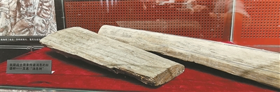 展柜中看似普通的兩塊木頭,實為文物“消息樹”。樹皮上,“中國報”等字跡仍能辨認(rèn)。
