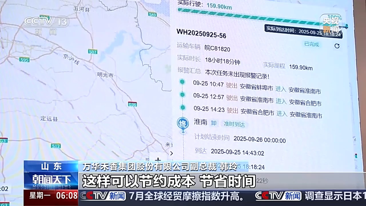 萬(wàn)華禾香集團(tuán)股份有限公司副總裁 韓玲:對(duì)于固定的線路,我們有大量的數(shù)據(jù)支撐之后,方便我們的司機(jī)對(duì)整個(gè)運(yùn)輸?shù)木€路做一個(gè)最佳路徑的選擇,這樣可以節(jié)約成本,節(jié)省時(shí)間。