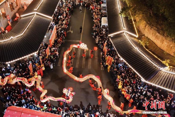 夜色中,鼓聲在街道上漸漸密集。伴隨著鼓點(diǎn),兩條金黃草龍翻騰而來(lái),龍頭高昂,龍身起伏,數(shù)十名舞龍者腳步整齊,帶動(dòng)整條草龍如浪般滾動(dòng)。
