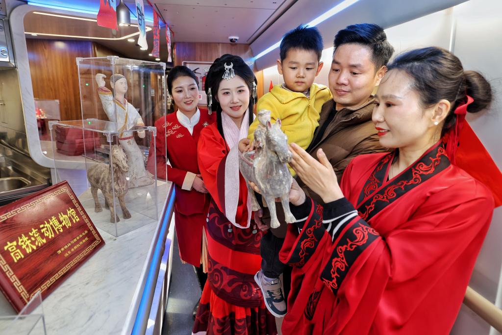 2月11日,西安北開往香港西九龍的G916次陜港高鐵列車上,身著漢服的工作人員向旅客展示漢代馬形文物復制品,并講解相關(guān)歷史文化。(國鐵西安局集團公司供圖)