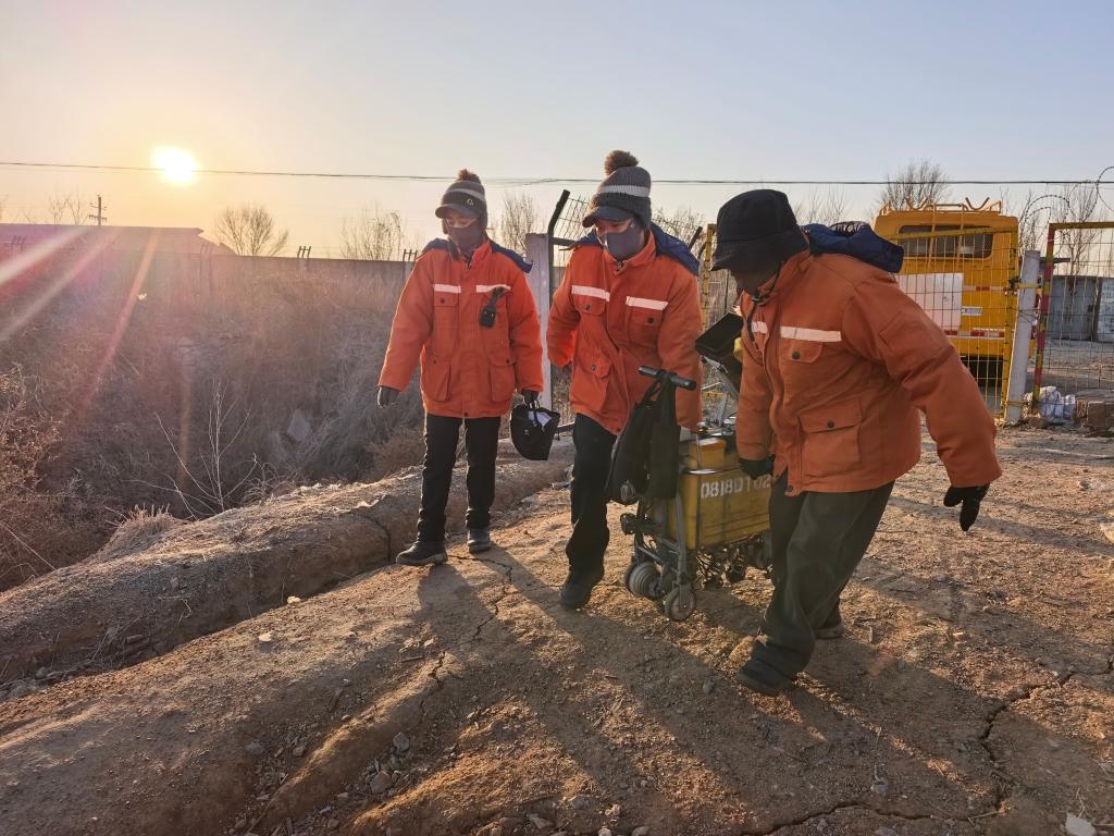 隊(duì)員們抵達(dá)作業(yè)地點(diǎn),抬著探傷儀走向鐵軌。新華社記者 郭雅茹 攝