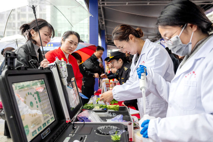 在浙江省湖州市長興縣放心消費(fèi)嘉年華公益活動(dòng)現(xiàn)場,該縣食品藥品檢驗(yàn)檢測中心工作人員為市民提供免費(fèi)果蔬檢測服務(wù)(2025年3月15日攝)。