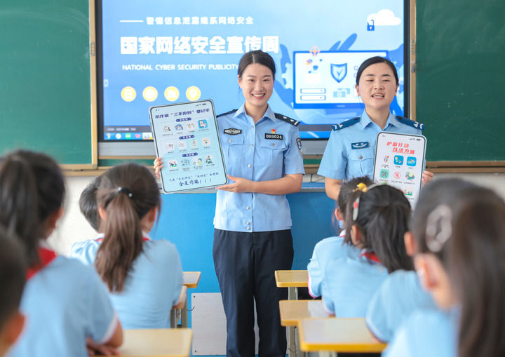 在山東省榮成市府新小學(xué)教室內(nèi),轄區(qū)民警通過案例講解為學(xué)生們普及網(wǎng)絡(luò)安全和防詐騙知識(shí)(2025年9月15日攝)。