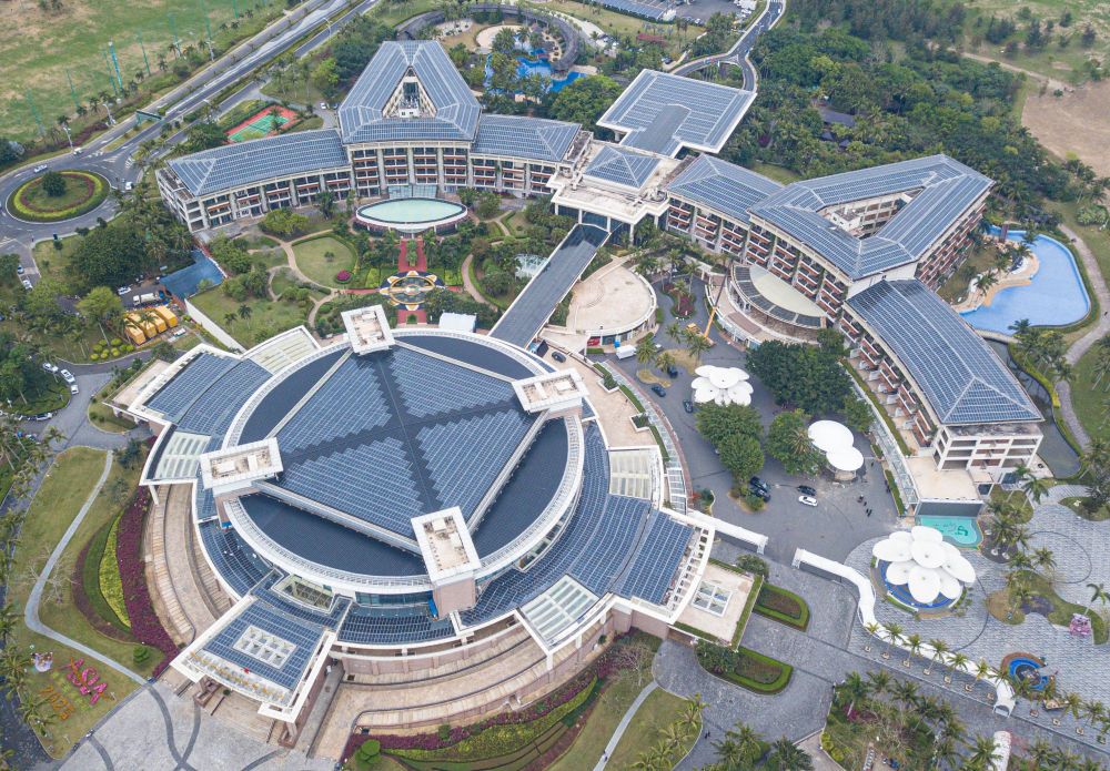 圖為博鰲亞洲論壇國際會議中心和博鰲亞洲論壇大酒店屋頂?shù)墓夥O(shè)備(2025年3月16日攝,無人機照片)。 新華社記者 蒲曉旭 攝