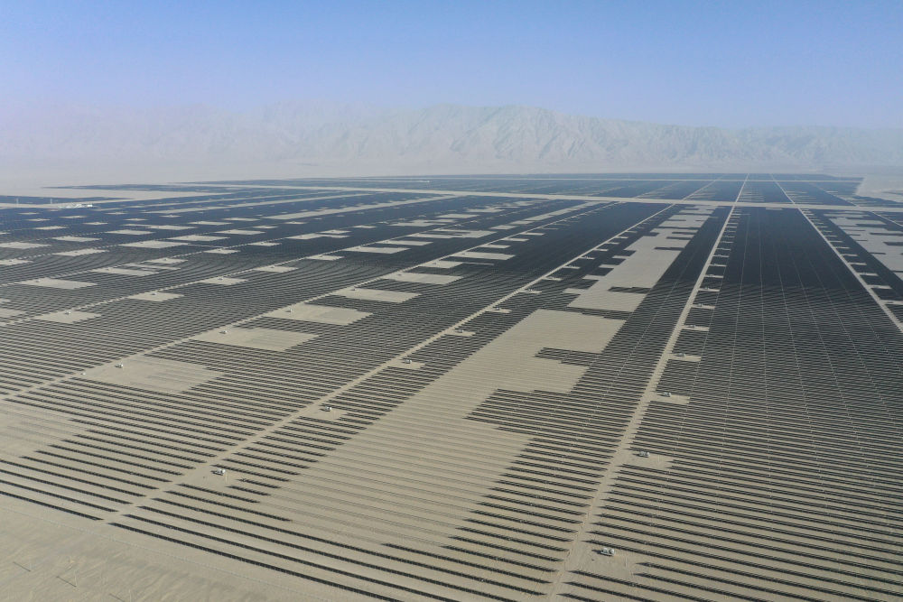 驅(qū)車行駛在巴音郭楞蒙古自治州若羌縣境內(nèi)的塔克拉瑪干沙漠邊緣,浩瀚沙海中,一片片深藍(lán)色光伏板如波浪般鋪展至天際。這里是一處400萬千瓦光伏項(xiàng)目現(xiàn)場。