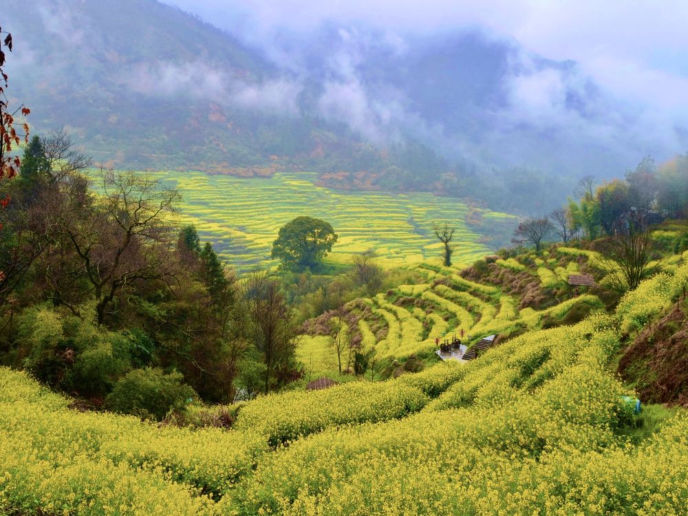 清晨的婺源江嶺景區(qū),晨霧剛剛散去,萬(wàn)畝梯田便在春光里鋪展開(kāi)來(lái),金黃的油菜花順著山勢(shì)層層疊疊涌向山腳。